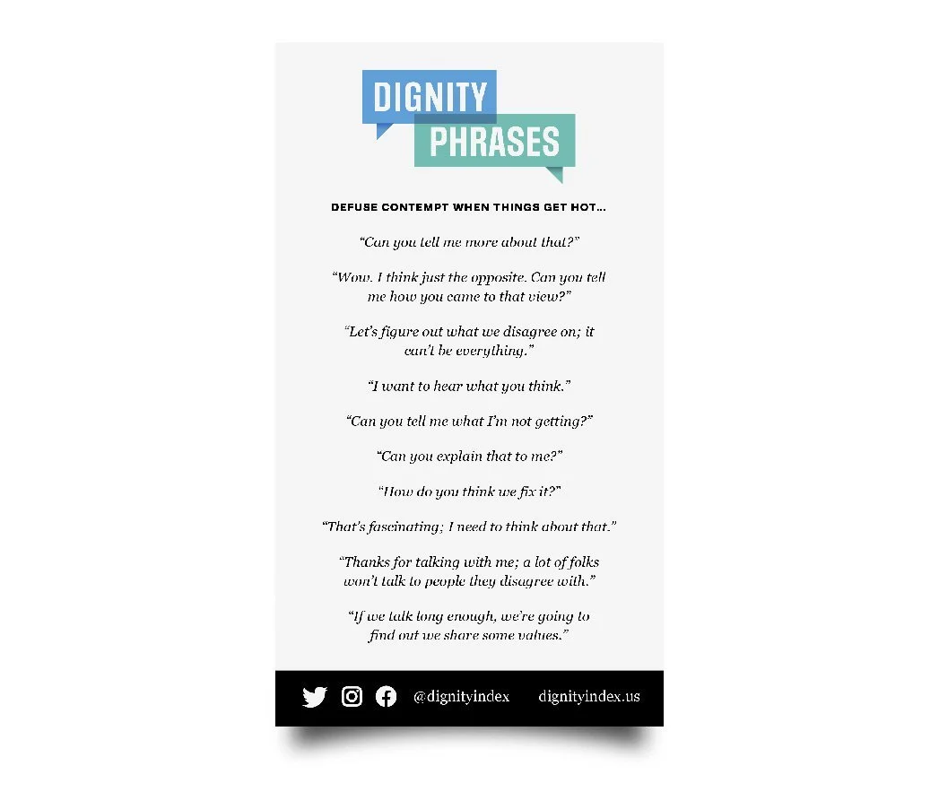The Dignity Index was created to help us understand that difference—and to offer a path forward. It's a framework for transforming conflict into connection, both in our families, workplaces, communities, and beyond. We encourage you to learn more, take the Dignity Pledge, and explore how you can support the dignity movement in your daily life.